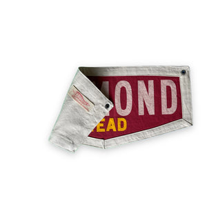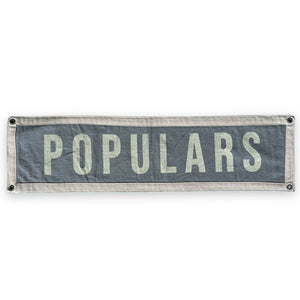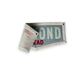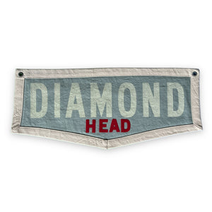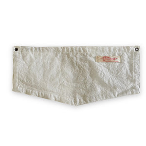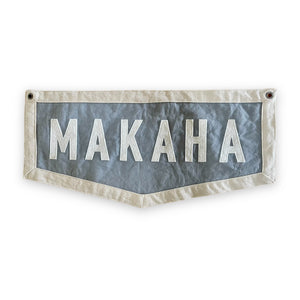 Either a wool blend felt or canvas is used for these hand cut letters that are then sewn onto a washed 10.oz cotton duck canvas. Backing is a same 10.oz canvas with the Hawaiian Standard branding on a loop of cotton twill taping. Aged solid brass grommets in corners for hanging.